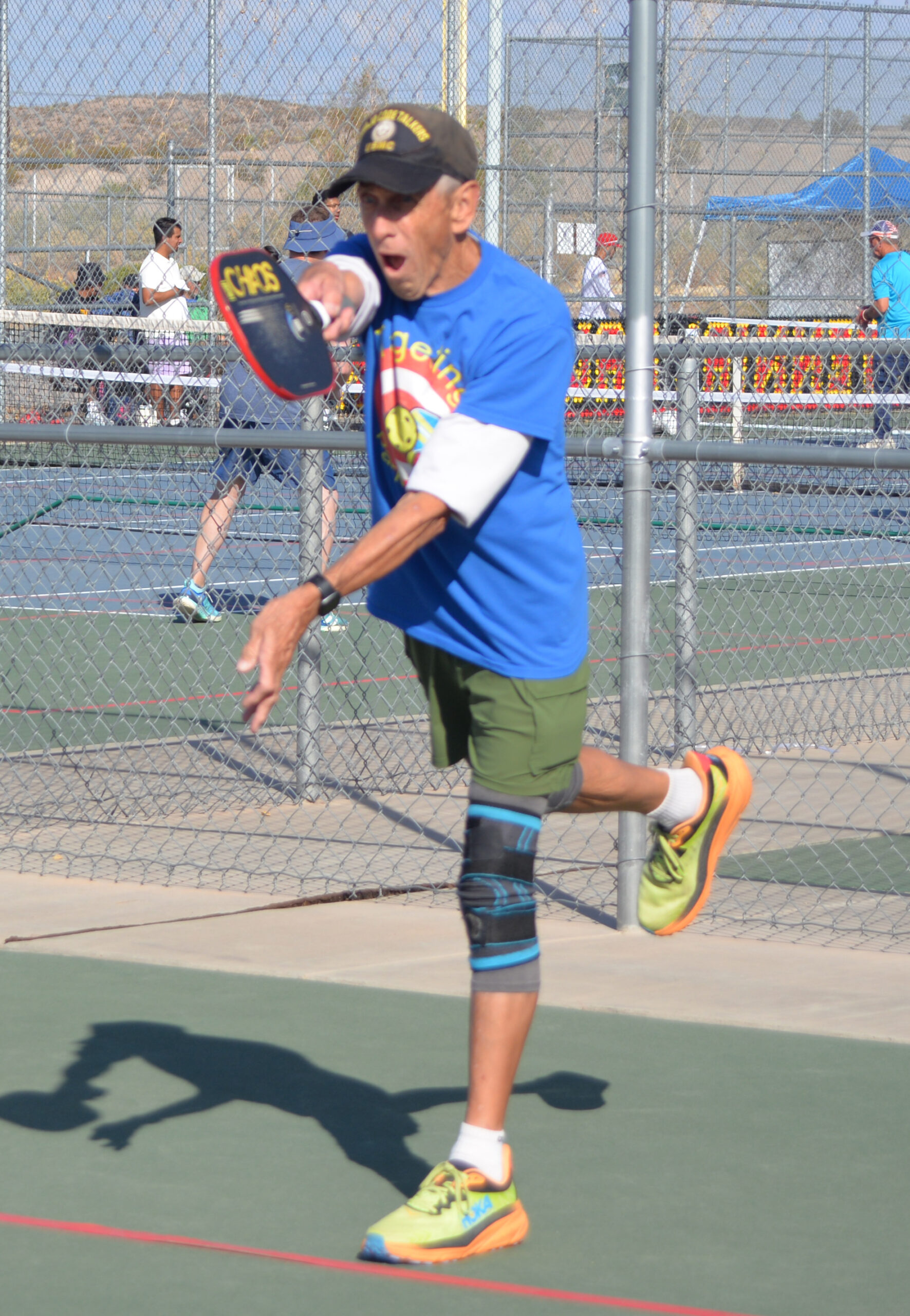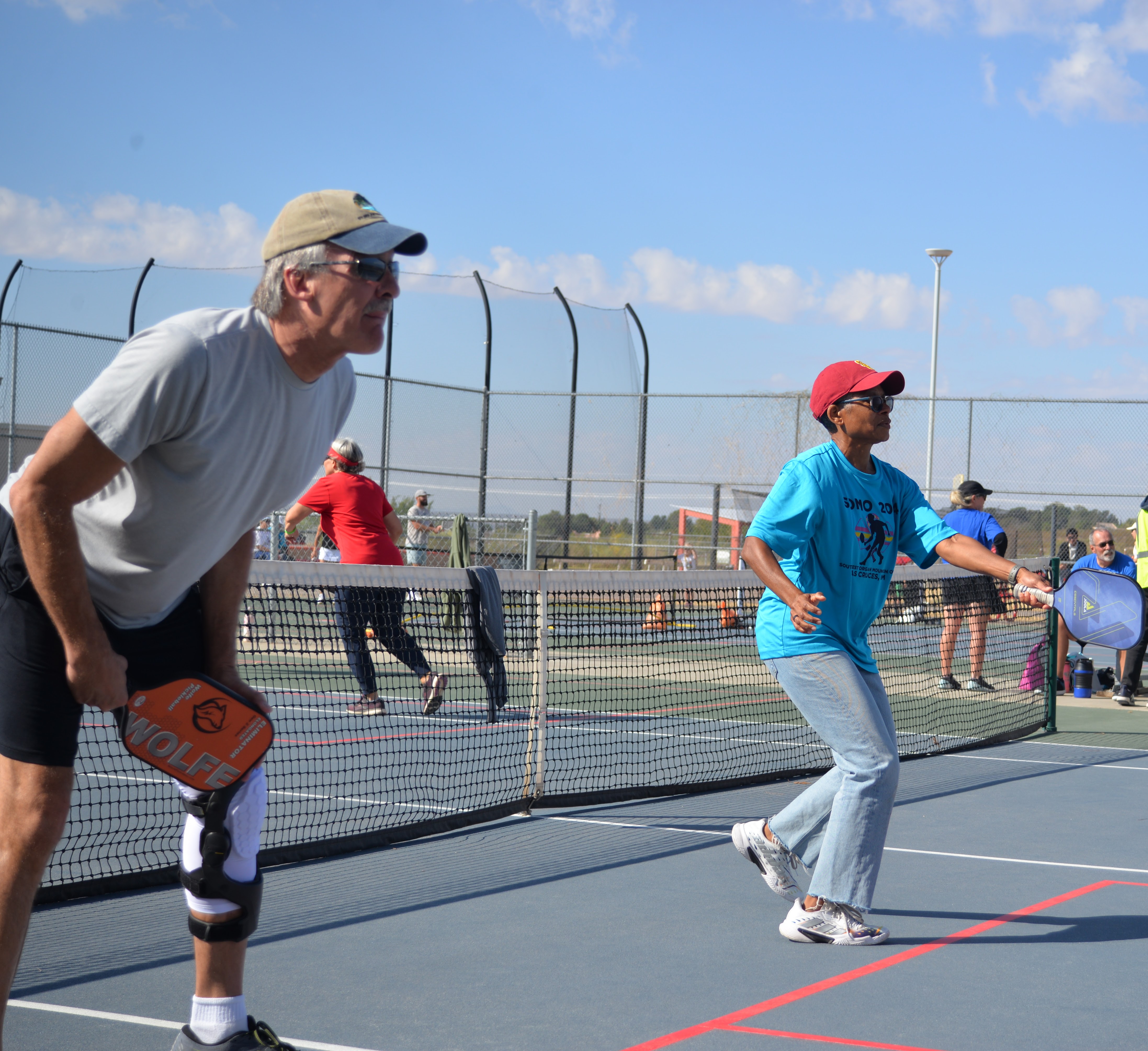 SOMO Southwest Organ Mountains Open Tournament at Centennial High School, October 20, 2024. Jennifer won Gold, Eddie won Silver and Barb (not pictured) won Bronze. Josie played in her first tournament. SOMO Players, friends and family came. Josie Celebrates a win. John in fine form. Hal hits the ball. Diane hits a return. Jennifer hits the ball. Dennis and Leslie played with us. Friends and Family cheered us on.